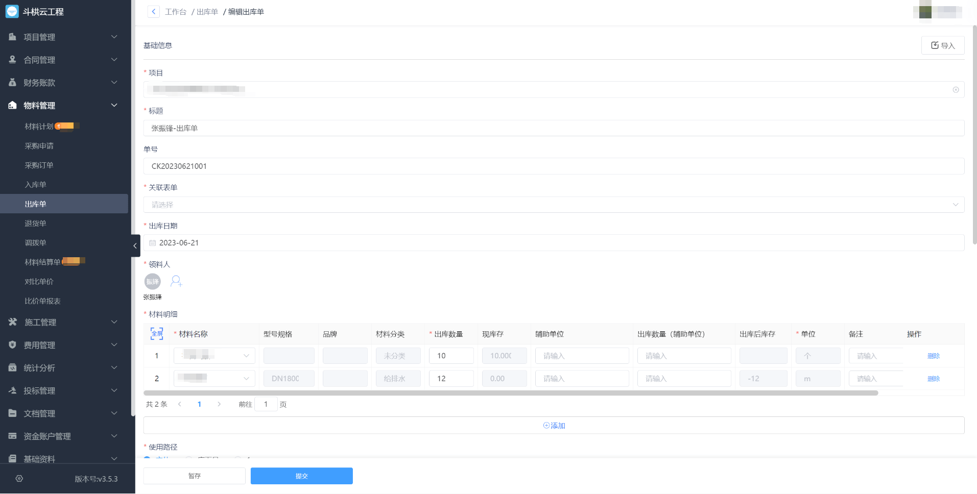 选择一项材料后,前往列表,出库单能够管控材料的出库环境,进入材料库存,切换到系统,继续完成,点击单据侧滑打开详情,材料库存中会展现该项目标库存环境。能够进行撤销打印或导出操做。其他消息的填写,或点开高级搜刮进行查找,如查找过往出库单,针对审批通过的单据,